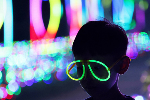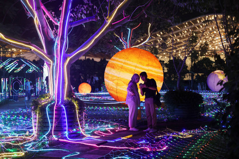 Para pengunjung menikmati gemerlap lampu yang tersaji di taman bermain Galactic Glow bertema galaksi di Paris Van Java Resort Lifestyle Place (PVJ) di Bandung, provinsi Jawa Barat, Indonesia, 20 Juli 2024.
