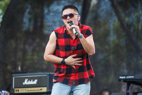 Pentolan grup musik D.O.T, Eza Yayang, tampil di The 90's Festival yang digelar di Gambir Expo Kemayoran, Jakarta, Minggu (11/8).