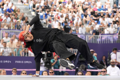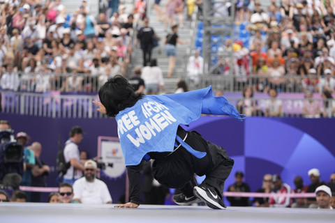 Manizha Talash dari Tim Pengungsi, mengenakan jubah bertuliskan "bebaskan wanita Afghanistan" saat bertanding dalam Pertarungan Pra-Kualifikasi B-Girls pada kompetisi pemecahan rekor di La Concorde Urban Park Olimpiade Paris 2024, Jumat (9/8/2024). Foto: Abbie Parr/AP Photo