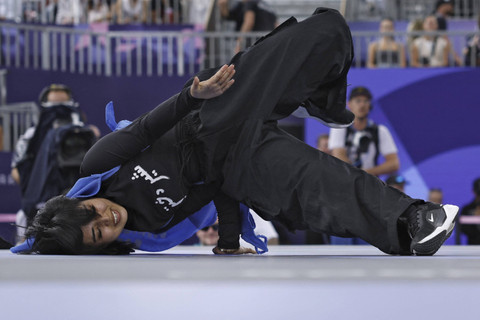 Manizha Talash dari Tim Pengungsi, mengenakan jubah bertuliskan "Bebaskan Perempuan Afghanistan" saat bertanding dalam Pertarungan Pra-Kualifikasi B-Girls pada kompetisi pemecahan rekor di La Concorde Urban Park Olimpiade Paris 2024, Jumat (9/8/2024).