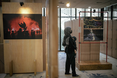 Pengunjung mengamati karya foto jurnalistik yang dipamerkan di Perpustakaan Jakarta Galeri PDS HB Jassin, kompleks Taman Ismail Marzuki (TIM), Jakarta Pusat, Minggu (25/8/2024). Foto: Jamal Ramadhan/kumparanPewarta Foto Indonesia (PFI) Jakarta menggelar pameran fotografi jurnalistik bertajuk Rekam Jakarta 2024: 'Sayonara Jakarta' yang berlangsung dari 23 sampai 31 Agustus 2024. Foto: Jamal Ramadhan/kumparanSalah satu kurator pameran, Dita Alangkara mengatakan pameran foto 'Sayonara Jakarta' adalah rangkuman berbagai peristiwa di Jakarta yang tersaji dalam rangkaian fragmen, mewakili emosi dan dinamika penduduknya. Foto: Jamal Ramadhan/kumparanPameran tersebut menampilkan 150 karya foto dari 38 pewarta foto anggota PFI Jakarta. Fotojurnalis kumparan.com, Aditia Noviansyah dan Jamal Ramadhan menjadi pameris dalam pameran tersebut. Foto: Jamal Ramadhan/kumparanFoto: Jamal Ramadhan/kumparan