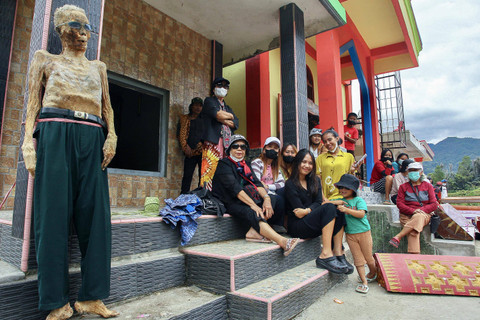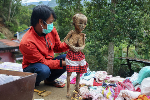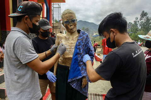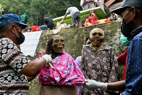 Anggota keluarga dari suku Toraja menangani jenazah mendiang kerabat mereka dalam serangkaian upacara adat untuk menghormati orang mati yang dikenal sebagai "Ma'nene", di Lempo Desa Po'ton di Toraja Utara, Sulawesi Selatan, pada 24 Agustus 2024.