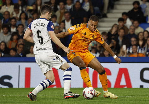 Pemain Real Madrid Kylian Mbappe saat beraksi pada pertandingan La Liga antara Real Sociedad melawan Real Madrid di Reale Arena, San Sebastian, Spanyol, Sabtu (14/9/2024). Foto: Vincent West/REUTERS