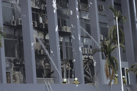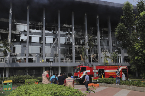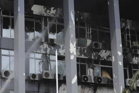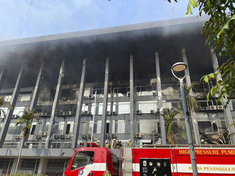 Petugas menyemprotkan air ke arah gedung yang terbakar di Gedung Badan Keamanan Laut (Bakamla) RI, Jalan Proklamasi, Pegangsaan, Menteng, Jakarta Pusat, Minggu (29/9/2024). Foto: Jamal Ramadhan/kumparan