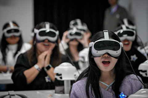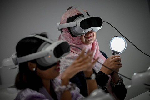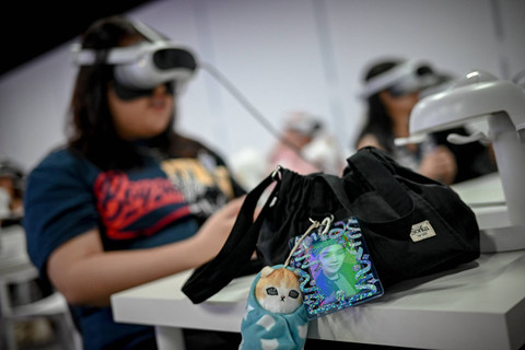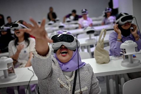 Sejumlah fandom BTS, ARMY Indonesia menikmati konser virtual reality BTS dalam pameran imersif The Fact Music Awards Exhibition BSTARVERSE di Mal Taman Anggrek, Jakarta, Sabtu (28/9/2024). Foto: Jamal Ramadhan/kumparan