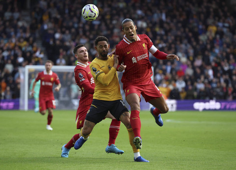 Pemain Liverpool Trent Alexander-Arnold beraksi dengan pemain Wolverhampton Wanderers Andre pada pertandingan Liga Inggris antara Liverpool melawan Wolverhampton di Stadion Molineux, Wolverhampton, Inggris, Sabtu (28/9/2024). Foto: PHIL NOBLE/REUTERS