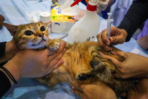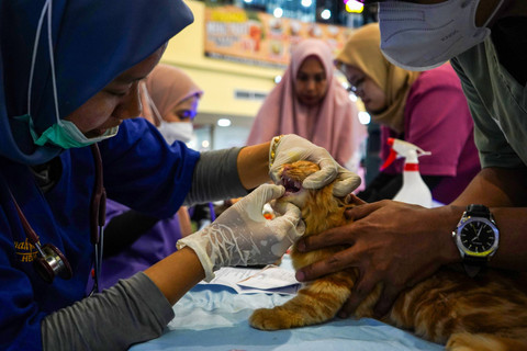 Dokter hewan memeriksa kesehatan mulut kucing sebelum vaksinasi rabies saat peringatan Hari Rabies Sedunia 2024 di Samarinda, Kaltim, Sabtu (28/9/2024). Foto: ANTARA FOTO/M Risyal Hidayat