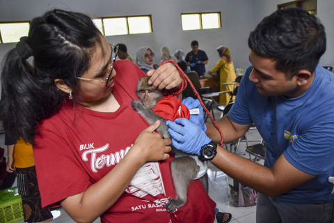 Dokter hewan memeriksa kesehatan mulut kucing sebelum vaksinasi rabies saat Hari Rabies Sedunia 2024 di Kota Makassar, Sulawesi Selatan, Sabtu (28/9/2024). Foto: ANTARA FOTO/Hasrul SaidKedokteran Hewan Unhas bekerja sama dengan Aliansi Peduli Hewan Indonesia (APHI) serta Dinas Peternakan dan Kesehatan Provinsi Sulsel membuka pelayanan vaksinasi rabies, pemeriksaan hewan dan edukasi rabies bagi masyarakat terutama pemelihara hewan agar bisa terbebas dari infeksi rabies. Foto: ANTARA FOTO/Hasrul SaidDokter hewan memeriksa kesehatan kucing sebelum vaksinasi rabies saat Hari Rabies Sedunia di Kabupaten Tasikmalaya, Jawa Barat, Sabtu (28/9/2024). Foto: ANTARA FOTO/Adeng BustomiDokter hewan memeriksa kesehatan monyet ekor panjang sebelum vaksinasi rabies saat Hari Rabies Sedunia di UPTD BPP Manonjaya, Kabupaten Tasikmalaya, Jawa Barat, Sabtu (28/9/2024) Foto: ANTARA FOTO/Adeng Bustomi