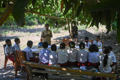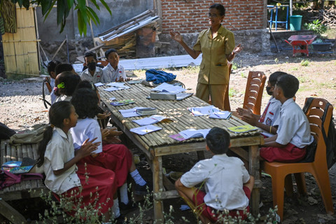 Para siswa ini tetap mengikuti kegiatan pembelajaran di halaman rumah guru mereka setelah sekolah dijadikan posko pengungsian korban erupsi Gunung Lewotobi Laki-Laki. Mereka belajar beratapkan langit.