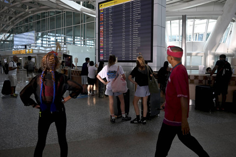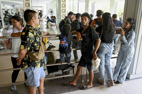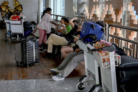 Para penumpang yang penerbangannya dibatalkan menunggu di Bandara Internasional Ngurah Rai, Denpasar, Bali, Rabu (13/11/2024). Foto: Sonny Tumbelaka/AFP
