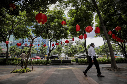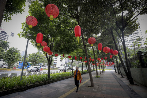 Warga melintasi trotoar yang kini terlihat meriah dengan hiasan lampion di salah satu ruas Jalan Jenderal Sudirman, Jakarta, Senin (20/1/2025). Foto: Jamal Ramadhan/kumparan