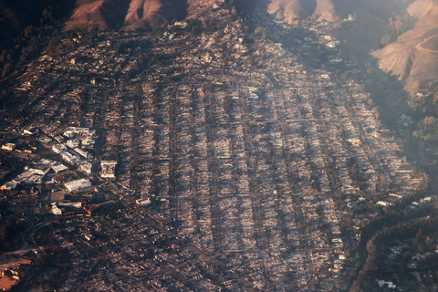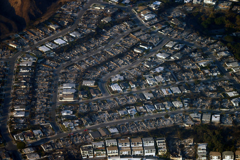 Foto udara menujukkan rumah-rumah milik warga LA hangus terbakar. Kondisinya sudah rata dengan tanah.