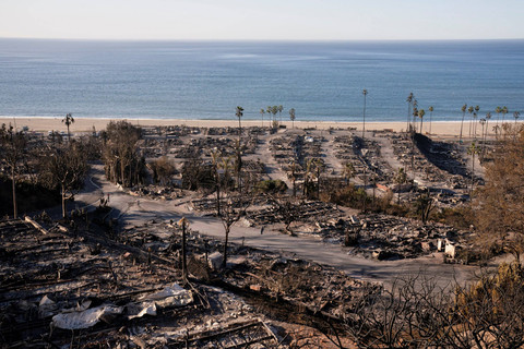 Foto udara memperlihatkan rumah-rumah yang hancur akibat kebakaran hutan di di kawasan Pacific Palisades, Los Angeles, California, Jumat (10/1/2025). Foto: DAVID SWANSON / AFP