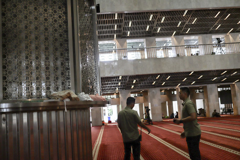 Petugas mulai melakukan persiapan menyambut malam takbiran dan pelaksaan Salat Idul Fitri di Masjid Istiqlal, Jakarta, Minggu (30/3).