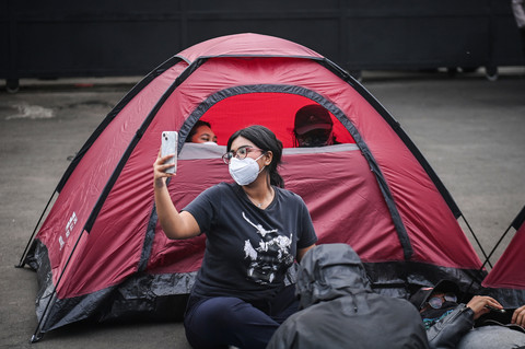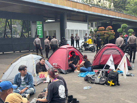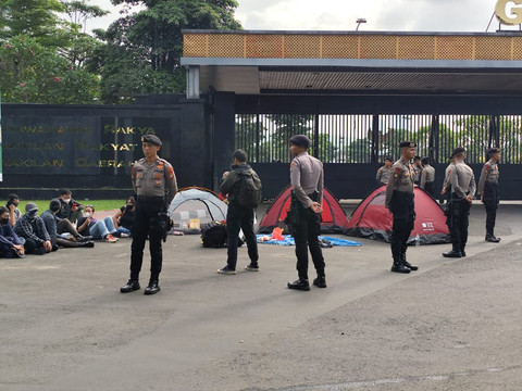 Pengunjuk rasa duduk di dalam tenda yang didirikan di depan pintu gerbang Pancasila, Gedung DPR RI, Jakarta, Kamis (20/3/2025).