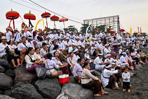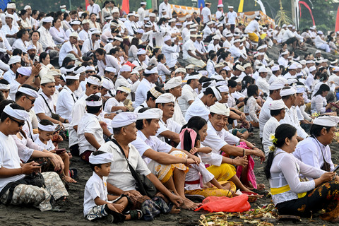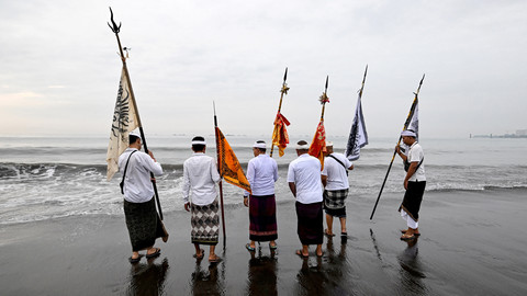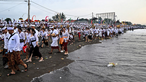 Seorang pria dalam kondisi tidak sadar memegang belati di kepalanya selama upacara Melasti di pantai Petitenget di Seminyak, pulau resor Bali, Indonesia, pada tanggal 26 Maret 2025. Foto: Sonny Tumbelaka / AFPRibuan umat Hindu atau pemadek yang berasal dari lima desa kawasan Kecamatan Kediri, Kabupaten Tabanan, Bali, Rabu, mengikuti upacara Melasti di objek wisata Tanah Lot, Tabanan, Bali, pada 26 Maret 2025. Foto: Sonny Tumbelaka / AFPUpacara Melasti adalah festival penyucian yang diadakan beberapa hari sebelum "Nyepi", hari hening, saat umat Hindu tidak diperbolehkan bekerja, bepergian, atau melakukan kegiatan apa pun. Foto: Sonny Tumbelaka / AFPHari Raya Nyepi yang jatuh pada Sabtu 29 Maret 2025 yang menjadi momen sakral umat Hindu untuk menyambut Tahun Baru Saka 1947. Foto: Sonny Tumbelaka / AFPPerayaan Nyepi 2025 tidak sekedar ritual keagaman melainkan juga untuk merenung, memperbaiki diri, dan mencapai kehidupan yang harmonis. Foto: Sonny Tumbelaka / AFPFoto: Sonny Tumbelaka / AFP