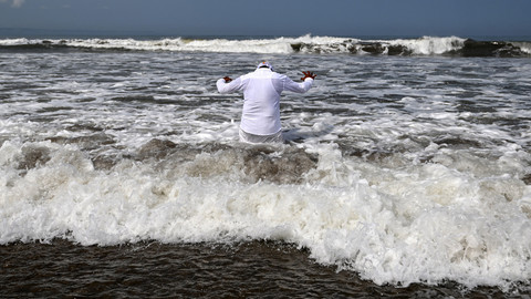Umat Hindu berdoa selama upacara Melasti di pantai di daerah Denpasar, Rabu (27/3). Foto: Sonny Tumbelaka / AFP