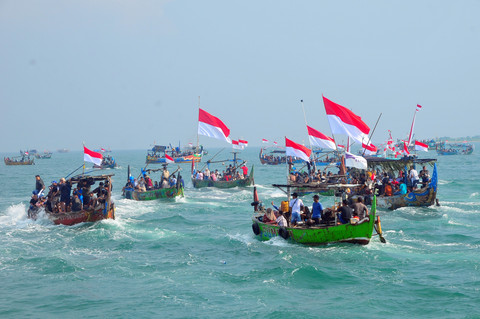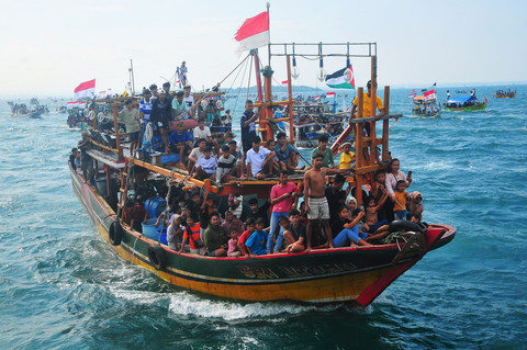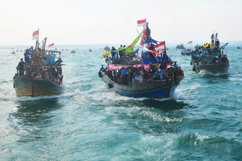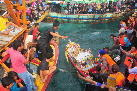 Ribuan warga dan nelayan mengikuti prosesi Pesta Lomban di perairan Pelabuhan Kartini, Jepara, Jawa Tengah, Senin (7/4). Foto: Yusuf Nugroho/ANTARA FOTOTradisi yang digelar sepekan setelah Lebaran Idul Fitri ini berupa melarung sesaji berupa kepala kerbau dan hasil bumi. Foto: Yusuf Nugroho/ANTARA FOTOSesaji itu mulanya diletakkan di dalam sebuah miniatur kapal yang kemudian dibawa ke tengah laut untuk dilarung. Foto: Yusuf Nugroho/ANTARA FOTOProsesi ini dilakukan sebagai bentuk syukur dan harapan para nelayan kepada Tuhan atas rezeki tangkapan ikan yang melimpah serta keselamatan saat melaut. Foto: Yusuf Nugroho/ANTARA FOTOFoto: Yusuf Nugroho/ANTARA FOTO