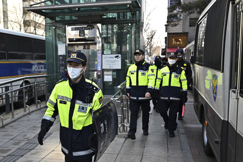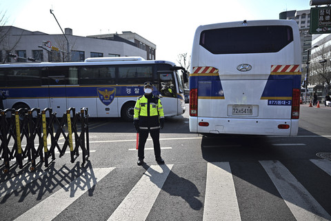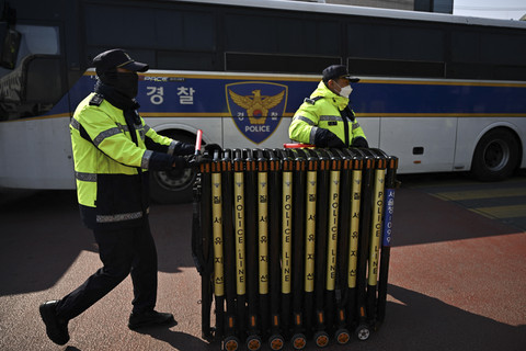 Petugas kepolisian berjaga menjelang sidang pemakzulan Presiden Korea Selatan Yoon Suk-yeol di Mahakamah Konstitusi Korea Selatan, Seoul, Kamis (3/4/2025). Foto: Pedro Pardo/AFP