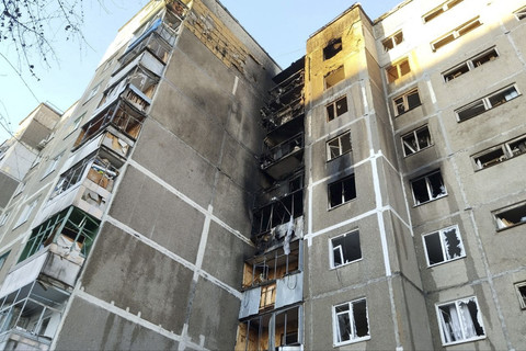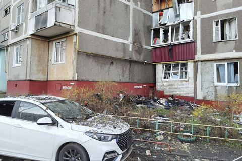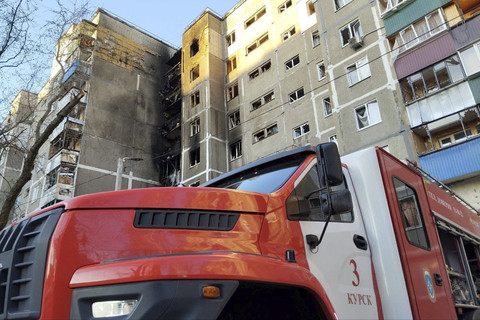 Suasana usai drone Ukraina menyerang salah satu apartemen di Kursk, Rusia, Selasa (15/4) waktu setempat.
