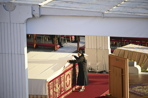 Sejumlah petugas melakukan persiapan saat Misa Pemakaman Paus Fransiskus di Lapangan Santo Petrus, Vatikan, Sabtu (26/4/2025). Foto: Alberto Pizzoli/AFP