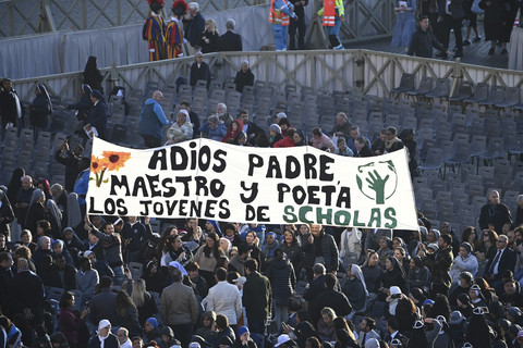 Umat yang hadir nampak berkumpul di Lapangan Santo Petrus dengan membawa anak-anak serta spanduk mengenang Paus Fransiskus.