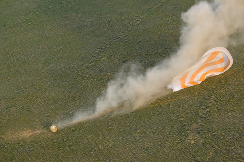 Kapsul antariksa Soyuz MS-26 yang membawa awak Stasiun Luar Angkasa Internasional (ISS) mendarat di Zhezkazgan, Kazakhstan, Minggu (20/4/2025). Foto: NASA/Bill Ingalls/HO via REUTERS