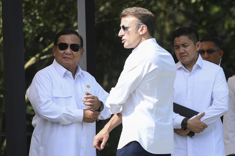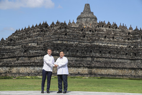 Presiden Prancis Emmanuel Macron dan Presiden RI Prabowo Subianto tiba di Candi Borobudur, Magelang Jawa Tengah, Kamis (29/5). Foto: Yasuyoshi Chiba/AFPMacron dan Prabowo masuk Candi Borobudur melalui gerbang kawasan Kenari. Foto: Galih Pradipta/ANTARA FOTODalam kunjungan di candi yang dibangun pada 750-850 Masehi oleh Dinasti Syailendra dari Kerajaan Mataram Kuno tersebut keduanya akan menyampaikan sejumlah kesepakatan antarkedua negara. Foto: Yasuyoshi Chiba/AFPFoto: Ludovic Marin/AFPFoto: Yasuyoshi Chiba/AFP