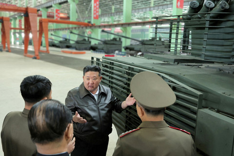 Pemimpin Korea Utara Kim Jong-un melihat tank lapis baja di fasilitas peralatan militer yang tidak ditentukan lokasinya di Korea Utara. Foto: KCNA/via REUTERS