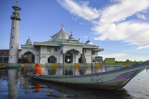 Seorang bocah mendayung melintasi Desa Muara Enggelam, Kecamatan Muara Wis, Kabupaten Kutai Kartanegara, Kalimantan Timur, Sabtu (17/5/2025).