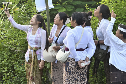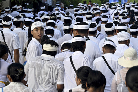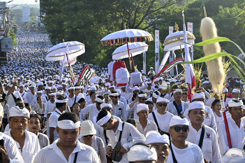Ribuan umat Hindu beriring-iringan berjalan kaki dengan membawa benda sakral menuju Pura Uluwatu saat rangkaian upacara Masupati Sesuhunan Ida Bhatara Dewa Ayu di Bali, Minggu (11/5/2025). Foto: Nyoman Hendra Wibowo/ANTARA FOTOUpacara sakral yang di gelar oleh Desa Adat Jimbaran ini berlangsung pada 11 hingga 12 Mei 2025. Foto: Sony Tumbelaka/AFPAdapun upacara tersebut diikuti sekitar 25 ribu umat Hindu dengan menempuh perjalanan sepanjang 15 km. Foto: Sony Tumbelaka/AFPFoto: Sony Tumbelaka/AFP
