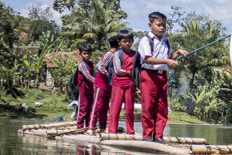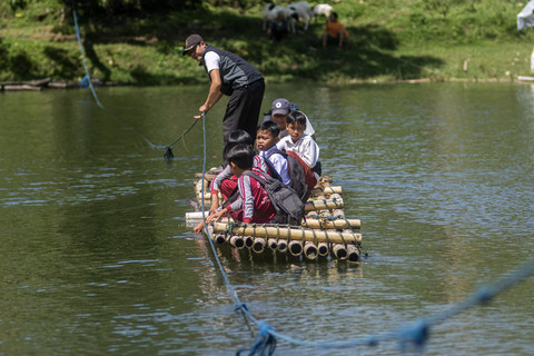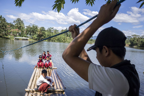 Sejumlah siswa SDN Panaruban menyeberangi sungai Cicadas menggunakan rakit di Cililin, Kabupaten Bandung Barat, Jawa Barat, Selasa (27/5). Foto: Abdan Syakura/ANTARA FOTODilansir Antara, warga dan siswa dari Kampung Sampora serta Kampung Cijigud, Kabupaten Bandung sejak tahun 1984 untuk sekolah atau mengakses pelayanan publik terpaksa menyeberangi sungai Cicadas menggunakan rakit. Foto: Abdan Syakura/ANTARA FOTODengan adanya rakit tersebut dapat memangkas waktu perjalanan menjadi 10 menit dibandingkan dengan jalur darat yang mencapai satu jam. Foto: Abdan Syakura/ANTARA FOTOFoto: Abdan Syakura/ANTARA FOTO
