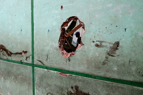 Bangunan sekolah berwarna hijau ini hancur. Atapnya yang terbuat dari besi rontok, dengan lubang-lubang besar menembus tembok bata sekolah itu. Puing-puing bangunan berserakan di luar gedung sekolah.