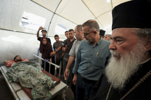 Patriark Latin Yerusalem Uskup Agung Pierbattista Pizzaballa dan Patriark Ortodoks Yunani Yerusalem, Theophilos III mengunjungi Rumah Sakit Arab Al-Ahli di Gaza, Jumat (18/7/2025). Foto: Dawoud Abu Alkas/REUTERS