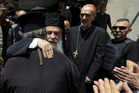 Kardinal Pierbattista Pizzaballa yang merupakan pemimpin gereja Katolik di Yerusalem mendatangi Gaza, Jumat (18/7) waktu setempat. Dalam kunjungannya, Kardinal Pizzaballa itu bersama Patriark Ortodoks Yunani Yerusalem, Teofilos III.
