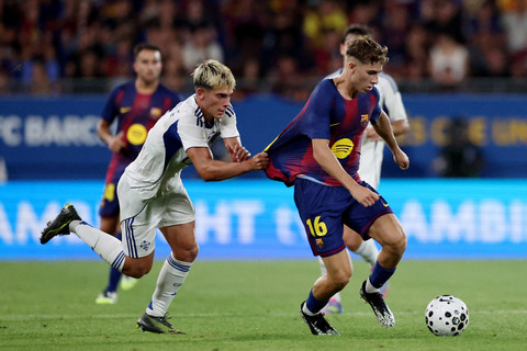 Pemain FC Barcelona Eric Garcia berebut bola dengan pemain Como Martin Baturina pada pertandingan persahabatan Trofi Joan Gamper di Estadi Johan Cruyff, Barcelona, Spanyol, Minggu (10/8/2025). Foto: Bruna Casas/ REUTERS