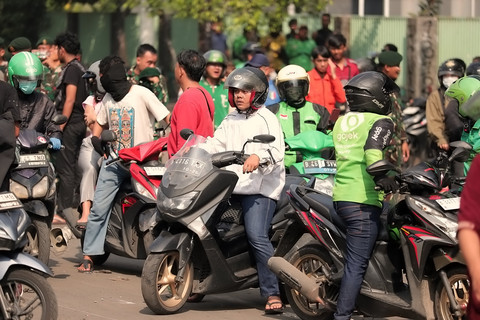 Begitu juga massa, mayoritas dari mereka bersiap menggunakan helm dan seragam ojol berlogo platformnya masing-masing.