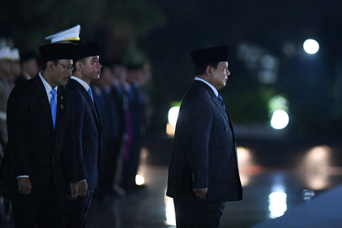 Presiden Prabowo Subianto memimpin upacara apel kehormatan dan renungan suci di Taman Makam Pahlawan (TMP) Kalibata, Jakarta Selatan, pada Minggu (17/8) dini hari. Foto: Muhammad Adimaja/ANTARA FOTOPrabowo datang didampingi Wakil Presiden Gibran Rakabuming Raka dan Menteri Sosial Saifullah Yusuf atau Gus Ipul. Foto: Muhammad Adimaja/ANTARA FOTOAcara yang digelar tepat pada pukul 00.00 WIB itu adalah rangkaian peringatan HUT ke-80 Kemerdekaan Republik Indonesia. Foto: Muhammad Adimaja/ANTARA FOTORangkaian upacara dimulai dari penyalaan lilin, doa bersama, peletakan bunga hingga tabur bunga di makam para pahlawan. Foto: Muhammad Adimaja/ANTARA FOTOHadir pula Kapolri Jenderal Listyo Sigit Prabowo, Panglima TNI Jenderal TNI Agus Subiyanto, Menteri Pertahanan Sjafrie Sjamsoeddin, Menteri Desa dan Pembangunan Daerah Tertinggal Yandri Susanto. Foto: Muhammad Adimaja/ANTARA FOTO