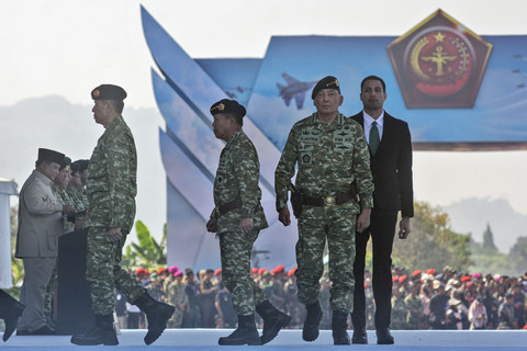 Presiden RI Prabowo Subianto menyematkan anugerah jenderal kehormatan dan kenaikan pangkat kehormatan kepada sejumlah purnawirawan dan perwira tinggi TNI saat Upacara Gelar Pasukan Operasional dan Kehormatan Militer di Lapangan Udara (Lanud) Suparlan Pusdiklatpassus, Batujajar, Kabupaten Bandung Barat, Jawa Barat, Minggu (10/8/2025). Foto: Abdan Syakura/ANTARA FOTOUpacara ini diikuti oleh 27.384 prajurit dari tiga matra TNI, yakni Komando Daerah Militer (Kodam), Komando Daerah Angkatan Laut (Kodaeral) dan Komando Daerah Angkatan Udara (Kodau). Foto: Abdan Syakura/ANTARA FOTOAdapun Presiden RI Prabowo Subianto menganugerahkan tanda pangkat Jenderal Kehormatan, menyematkan tanda jabatan Wakil Panglima TNI, menyerahkan piagam penghargaan Bintang Sakti kepada prajurit berintegritas tinggi serta meresmikan dan mengukuhkan sejumlah satuan baru TNI di antaranya peningkatan kepangkatan perwira tinggi pasukan elite TNI dan pembentukan enam Komando Daerah Militer (Kodam) baru. Foto: Abdan Syakura/ANTARA FOTOFoto: Abdan Syakura/ANTARA FOTO