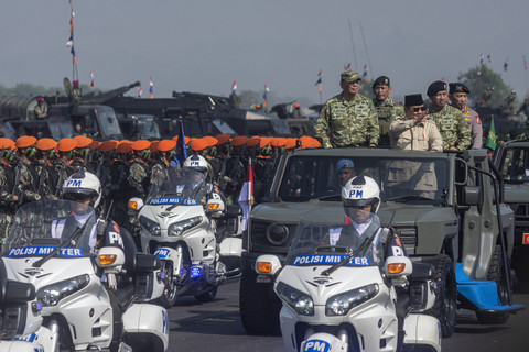 Presiden RI Prabowo Subianto didampingi Menhan Sjafrie Sjamsoeddin, Panglima TNI Jenderal Agus Subiyanto beserta jajaran memeriksa kesiapan pasukan saat Upacara Gelar Pasukan Operasional dan Kehormatan Militer di Batujajar, Minggu (10/8/2025). Foto: Abdan Syakura/ANTARA FOTO