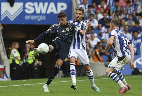 Arda Guler dari Real Madrid beraksi bersama Aritz Elustondo dari Real Sociedad pada pertandingan Liga Spanyol antara Real Sociedad v Real Madrid di Reale Arena, San Sebastian, Spanyol, Sabtu (13/9/2025). Foto: PANKRA NIETO/REUTERS