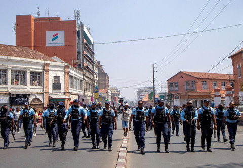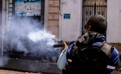 Sejumlah polisi menembakkan gas air mata untuk membubarkan massa yang memprotes seringnya pemadaman listrik dan kekurangan air di Antananarivo, Madagaskar, Jumat (26/9). Keadaan semakin ricuh sehingga aparat memberlakukan jam malam.