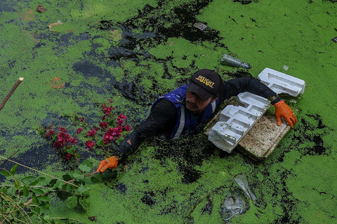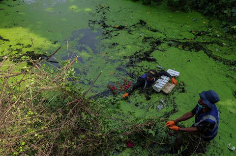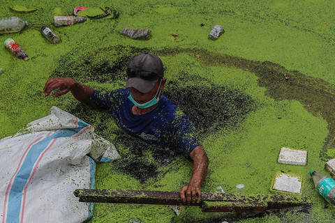 Seorang petugas Dinas Lingkungan Hidup Ternate menyisir kanal untuk mengumpulkan sampah yang mengapung di kanal dalam peringatan World Cleanup Day di Ternate, Maluku Utara, Sabtu (27/9/2025). Foto: Andri Saputra/ANTARA FOTO