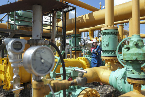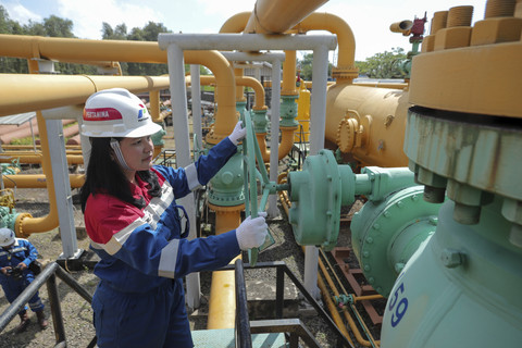 Pekerja melakukan pengecekan rutin pipa gas di simpang Y milik PT Pertamina Gas Operation South Sumatera Area (OSSA), Ogan Ilir (OI), Sumatera Selatan, Jumat (19/9).