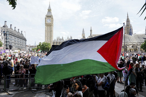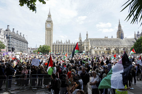 Para demonstran menghadiri demonstrasi untuk menentang larangan pemerintah Inggris atas "Aksi Palestina" berdasarkan undang-undang antiterorisme, di Parliament Square, London, Inggris, Sabtu (6/9).