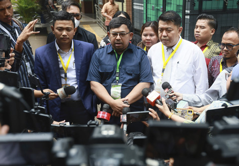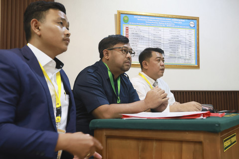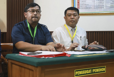 Ia hadir ke persidangan menggunakan kemeja berwarna biru tua dengan kacamata yang didampingi oleh kuasa hukumnya.
