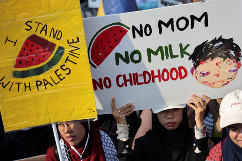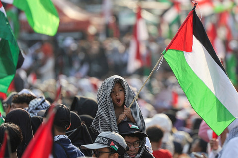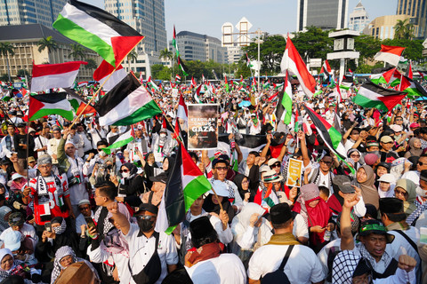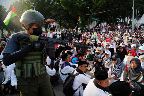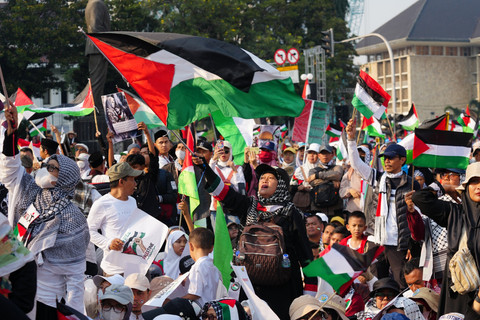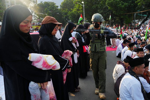 Foto: Aksi 'Indonesia Lawan Genosida di Gaza' Riuhkan Patung Kuda, Monas