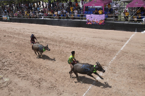Pembalap kerbau berlomba dalam festival balap kerbau tahunan di Chonburi, Thailand, Senin (6/10/2025). Foto: Sakchai Lalit/AP PhotoFestival ini digelar setiap bulan ke 11 kalender lunar untuk merayakan datangnya musim panen dan menyoroti hewan yang dulunya vital bagi pertanian di Thailand. Foto: Sakchai Lalit/AP PhotoDalam perayaan festival tersebut, kerbau menjadi daya tarik utama. Selain sebagai ajang adu balapan, di sini juga kerbau diadu dalam kontes kecantikan. Foto: Sakchai Lalit/AP PhotoPada festival tahun 2024, seekor kerbau albino terjual dengan harga 18 juta baht atau sekitar Rp11 miliar usai memenangkan kontes kecantikan kerbau. Foto: Sakchai Lalit/AP PhotoFoto: Sakchai Lalit/AP Photo