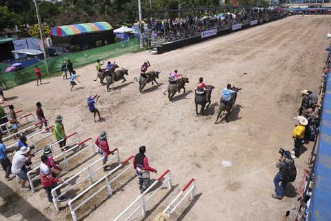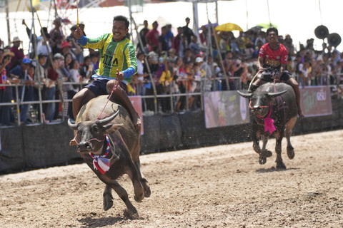 Pembalap kerbau berlomba dalam festival balap kerbau tahunan di Chonburi, Thailand, Senin (6/10).