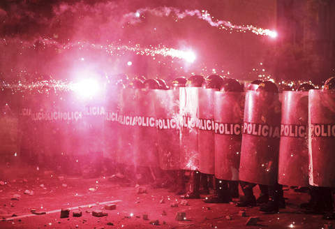 Demonstran terlibat bentrokan dengan petugas kepolisian anti huru-hara. Tampak para demonstran menembakan petasan ke arah petugas kepolisian.